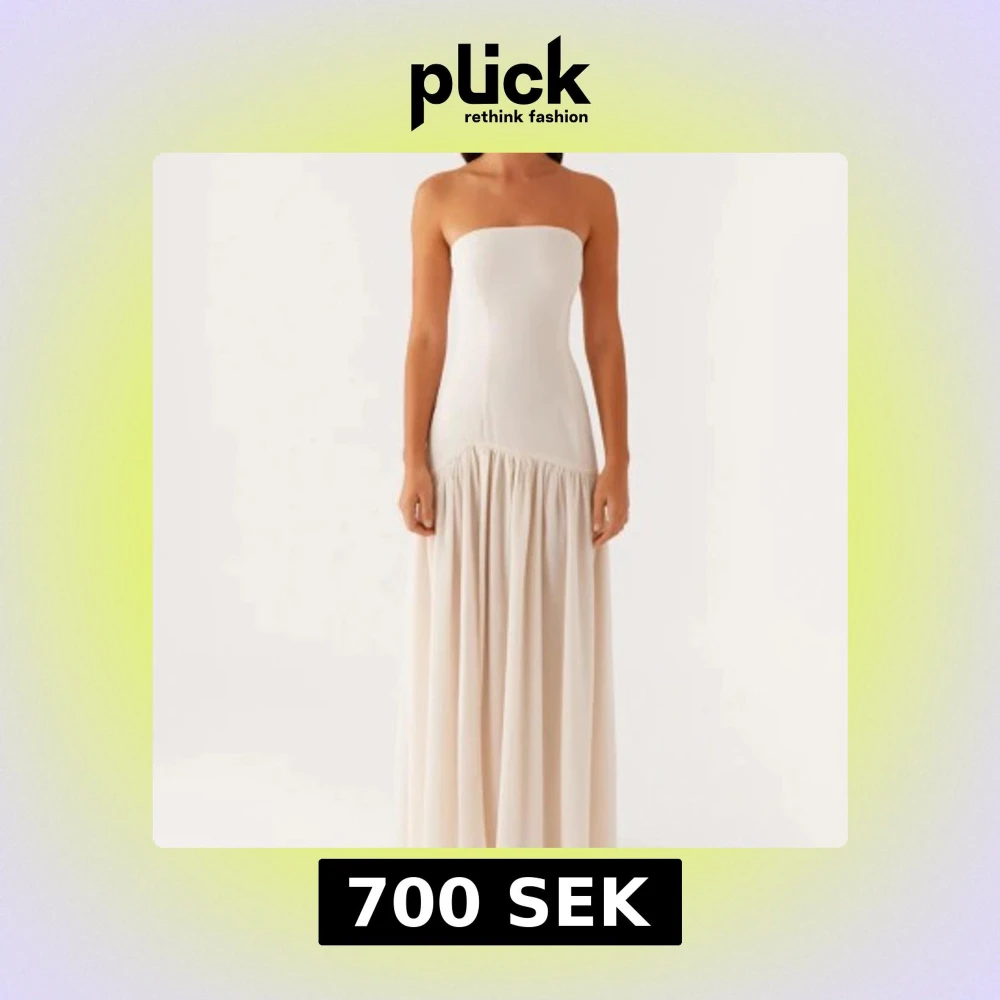 Superfin axelbandslös långklänning i ljus beige ton. Klänningen har en figurnära överdel och ett flowy, rynkat kjolparti med hög slits på ena sidan. Perfekt för dig som gillar minimalistisk och elegant stil. Aldrig använd med prislapp!