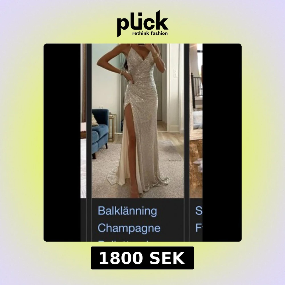 Elegant champagnefärgad balklänning med glittrande paljetter och en djärv slits. Klänningen har en v-ringad design och smala axelband, vilket ger en sofistikerad look. Perfekt för en glamorös kväll, jag är 176cm!🥂