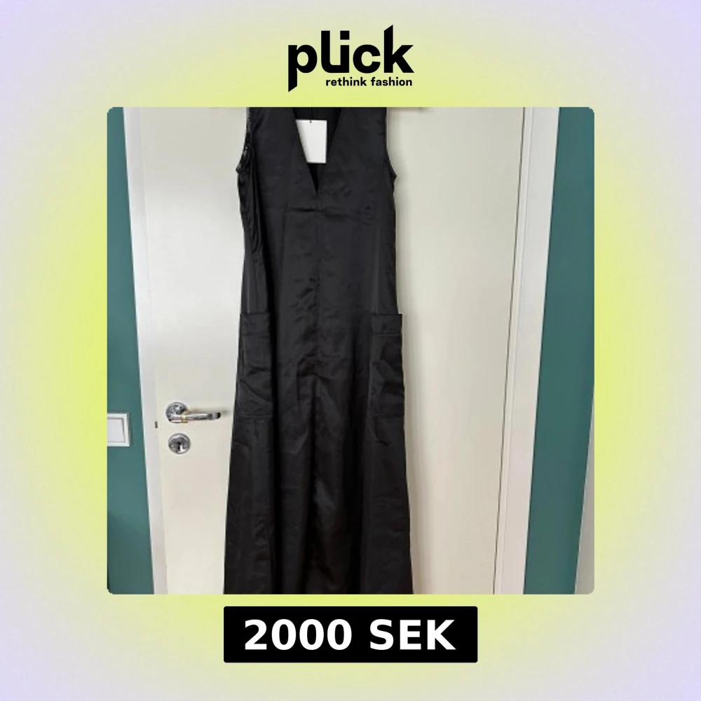 Svart ärmlös långklänning från Totême med djup v-ringning och två stora fickor framtill. Klänningen har subtila mönstrade detaljer längs kanterna och nedtill, vilket ger en cool kontrast. Materialet är mjukt och har ett lätt glansigt utseende.