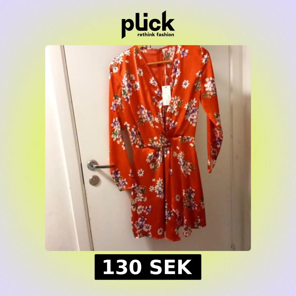 Superfin orange kortklänning från NLY Trend med blommigt mönster i vitt, lila och grönt. Klänningen har lång ärm, v-ringning och markerad midja. Materialet är glansigt och känns lyxigt, perfekt för dig som vill sticka ut med färg och mönster.
