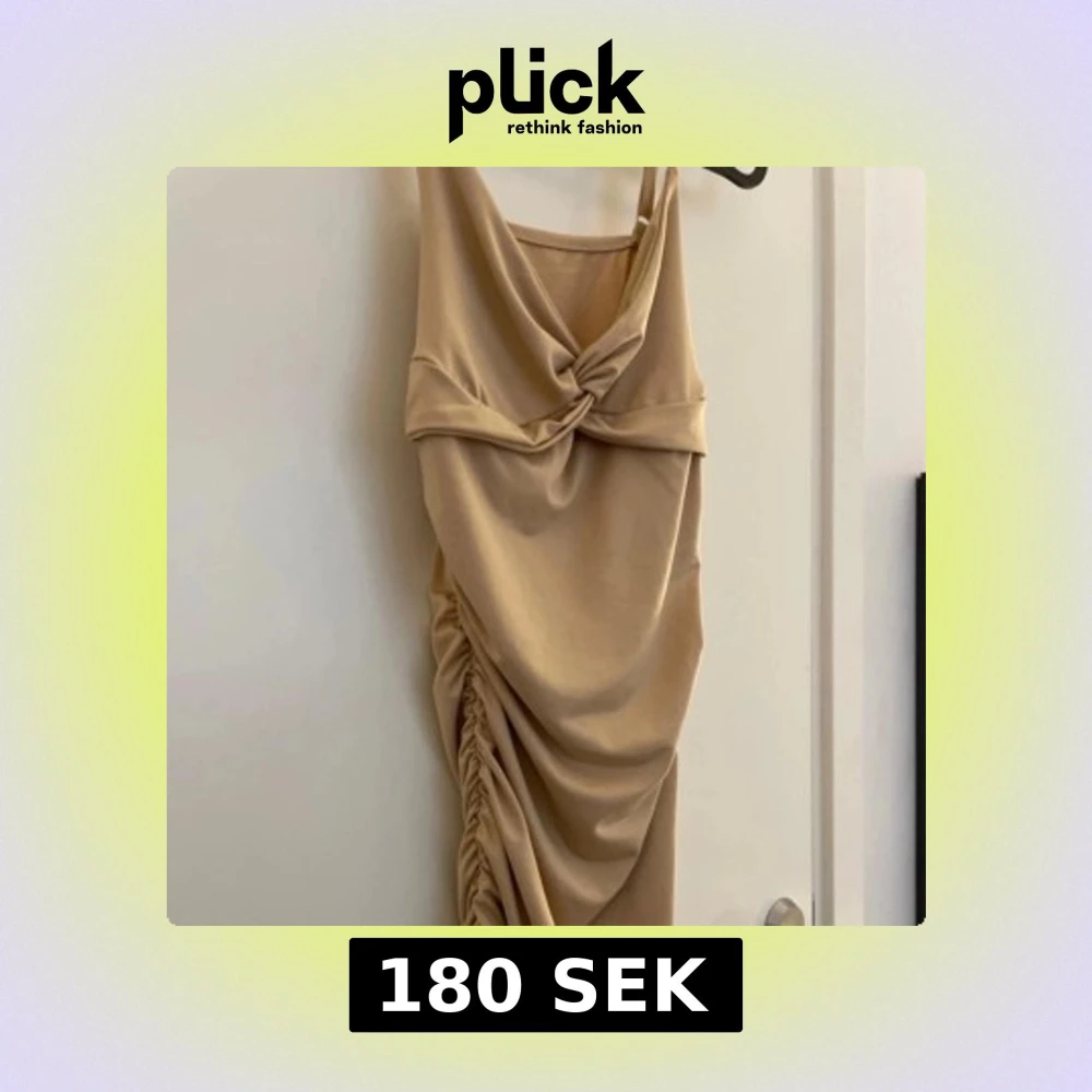 Säljer en elegant långklänning i champagnefärg med snygg drapering och twistad detalj framtill. Klänningen har smala axelband och en åtsittande passform med rynkade sidor för en extra fin look💞