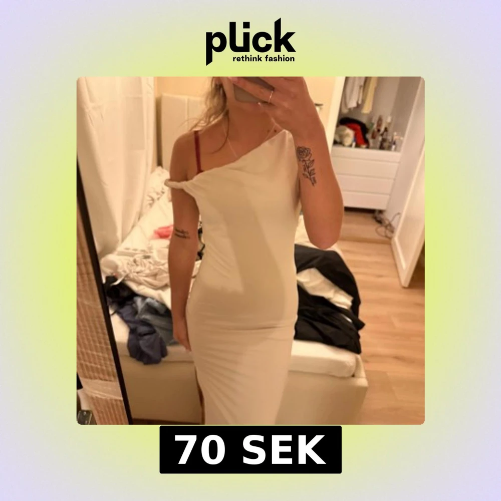Säljer en snygg beige långklänning med oneshoulder-design. Klänningen har en tight passform och ärmlös stil med en axel bar. Perfekt för dig som vill sticka ut med en stilren och trendig look.