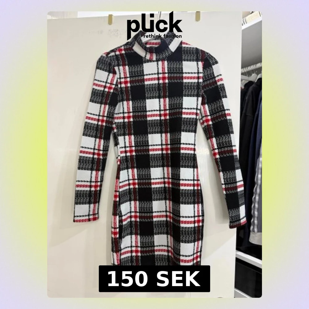 Säljer en snygg kortklänning med svart, vit och röd rutig design. Klänningen har lång ärm och polokrage, vilket ger en cool och trendig vibe. Materialet känns mjukt och stretchigt, perfekt för dig som gillar att sticka ut med mönster.