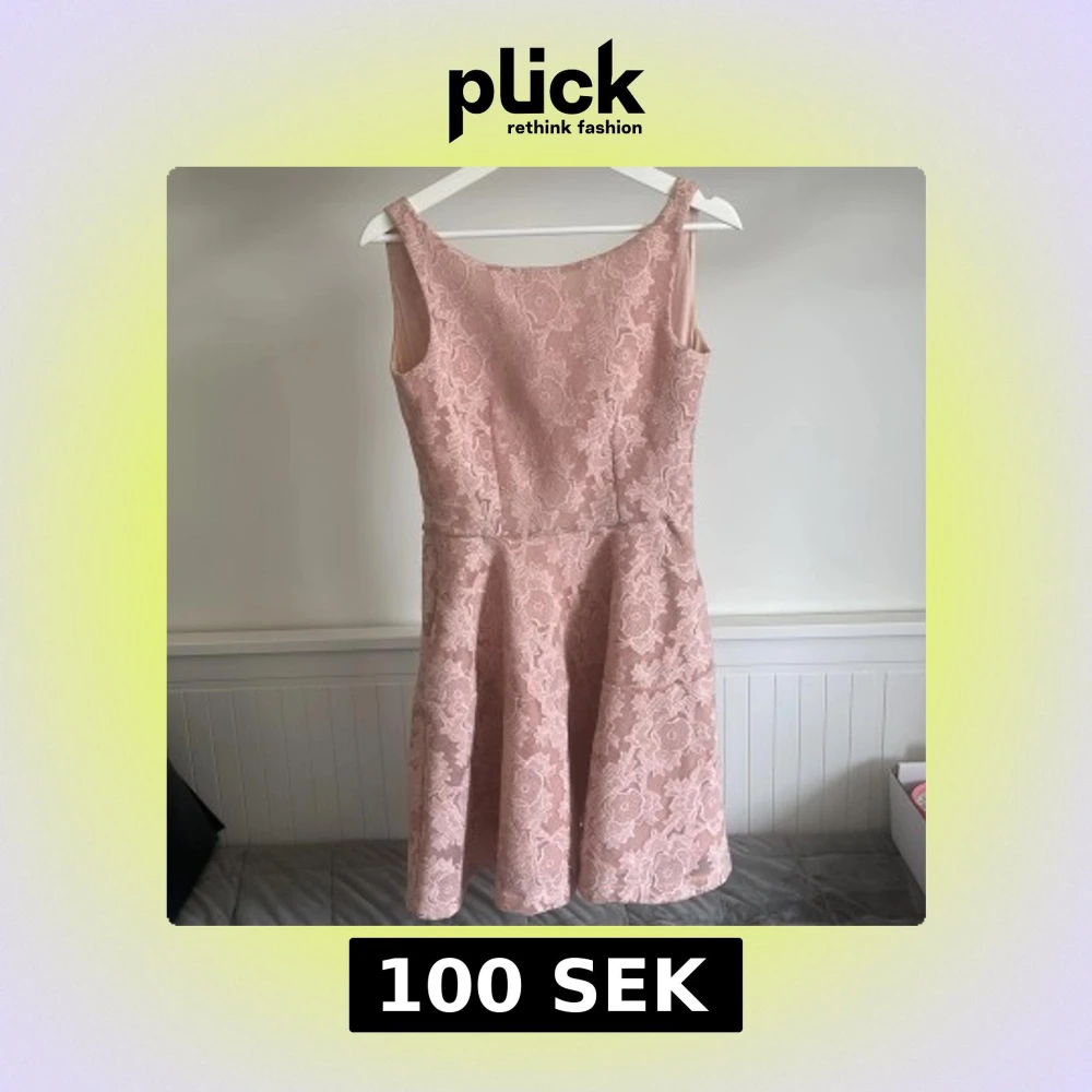 Söt ljusrosa klänning med blommigt spetsmönster och ärmlös design. Klänningen har rundad halsringning och en lätt utställd kjol som ger en feminin siluett. Perfekt för somriga tillfällen eller studentfirande.