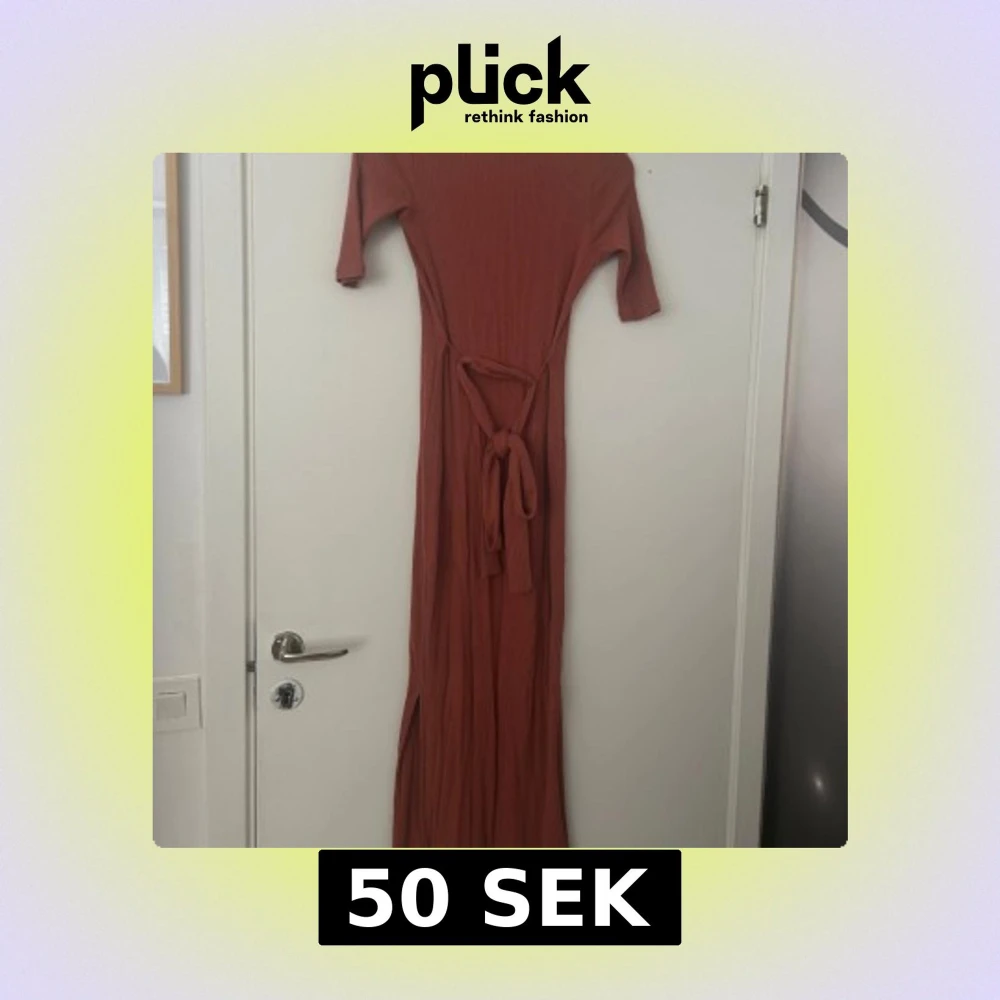 Säljer en långklänning i rostbrun färg med ribbad struktur. Klänningen har v-ringning, knappar hela vägen framtill, trekvartsärm och ett matchande bälte i midjan. Perfekt för dig som gillar en stilren och bekväm look har även en två slits.