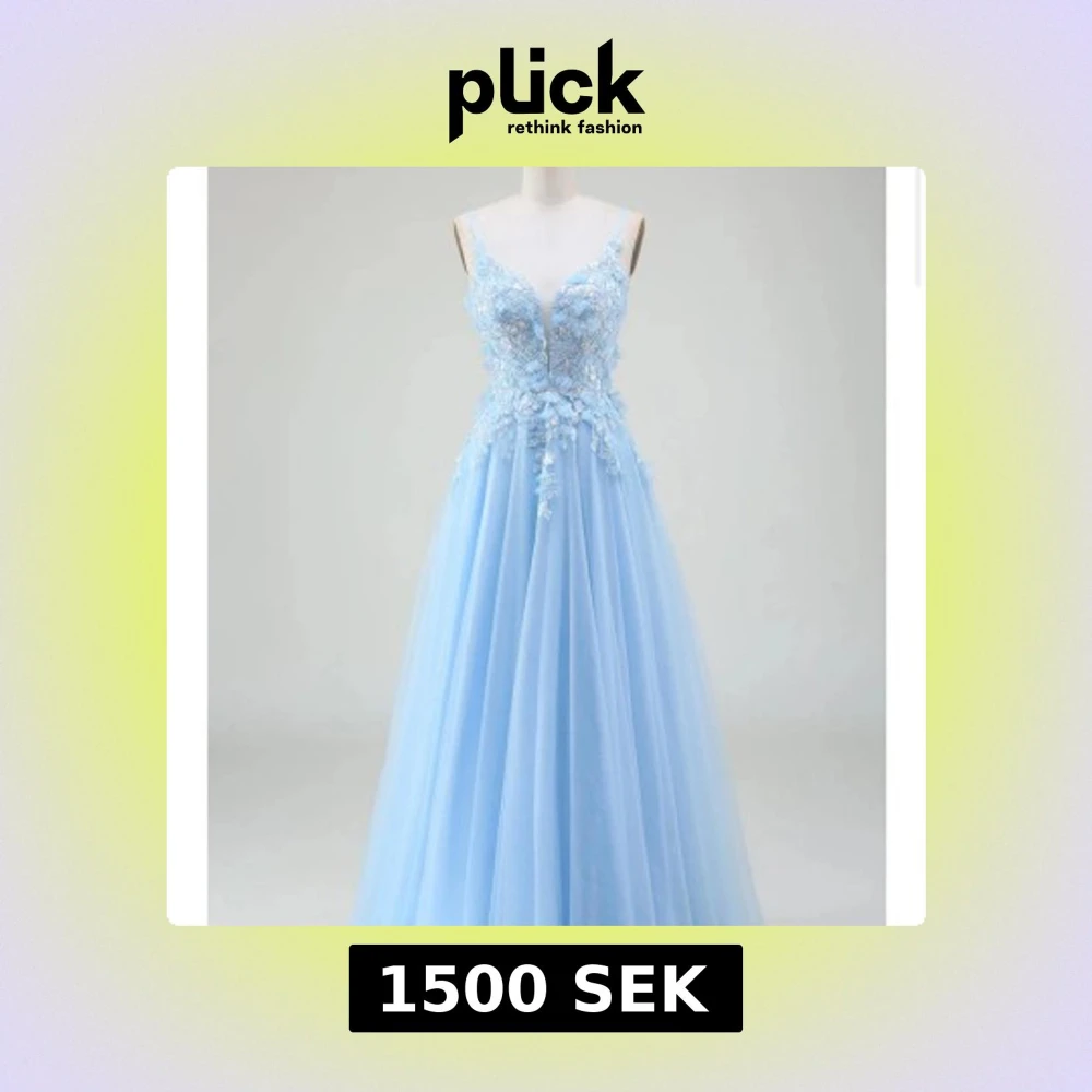 Säljer en ljusblå långklänning med tunna axelband och v-ringning. Klänningen har vackra blommiga spetsdetaljer och volanger upptill samt ett luftigt, svepande kjolparti i tyll. Perfekt för bal eller fest! 💙