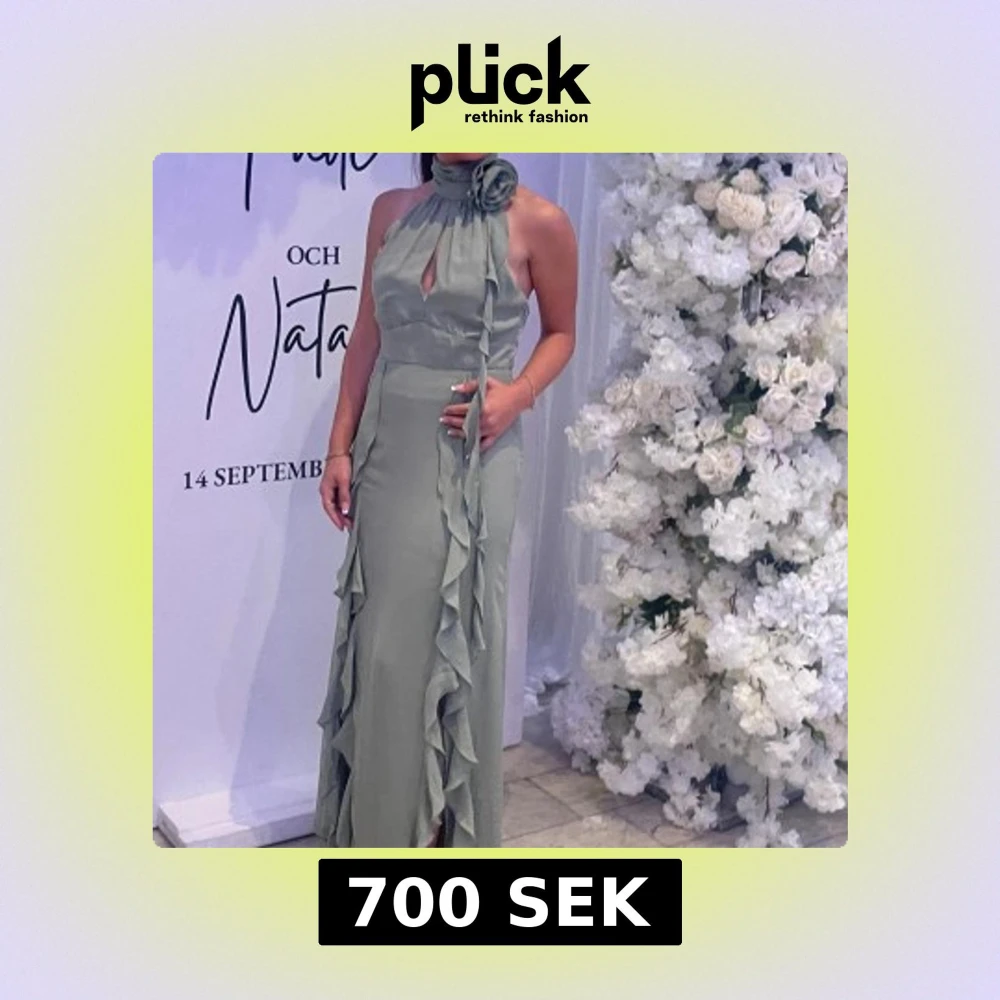 Supersnygg ljusgrön långklänning med hög hals och stor blomdetalj vid halsen. Klänningen har ärmlös design, volanger längs framsidan och en liten slits. Perfekt för dig som vill sticka ut med en elegant och unik look.