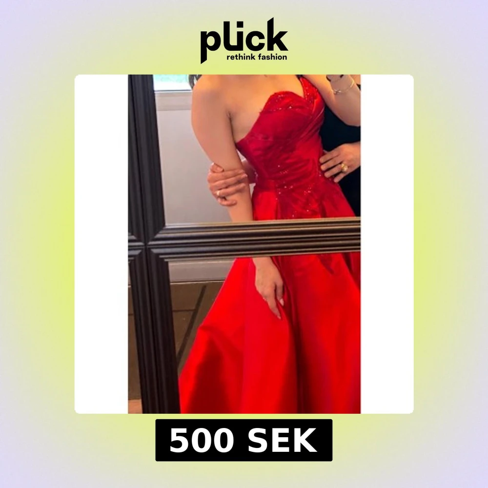 Säljer en röd axelbandslös långklänning med vacker paljettdekor upptill och draperad överdel. Klänningen har en markerad midja och vid kjol, perfekt för bal eller fest. Använd bara en gång. Pris går att diskutera