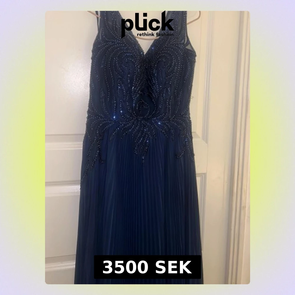 Elegant marinblå långklänning med djup v-ringning och tunna axelband. Överdelen är dekorerad med glittriga pärlor i ett unikt mönster och kjolen är plisserad för ett flytande fall. Perfekt för bal eller festliga tillfällen.