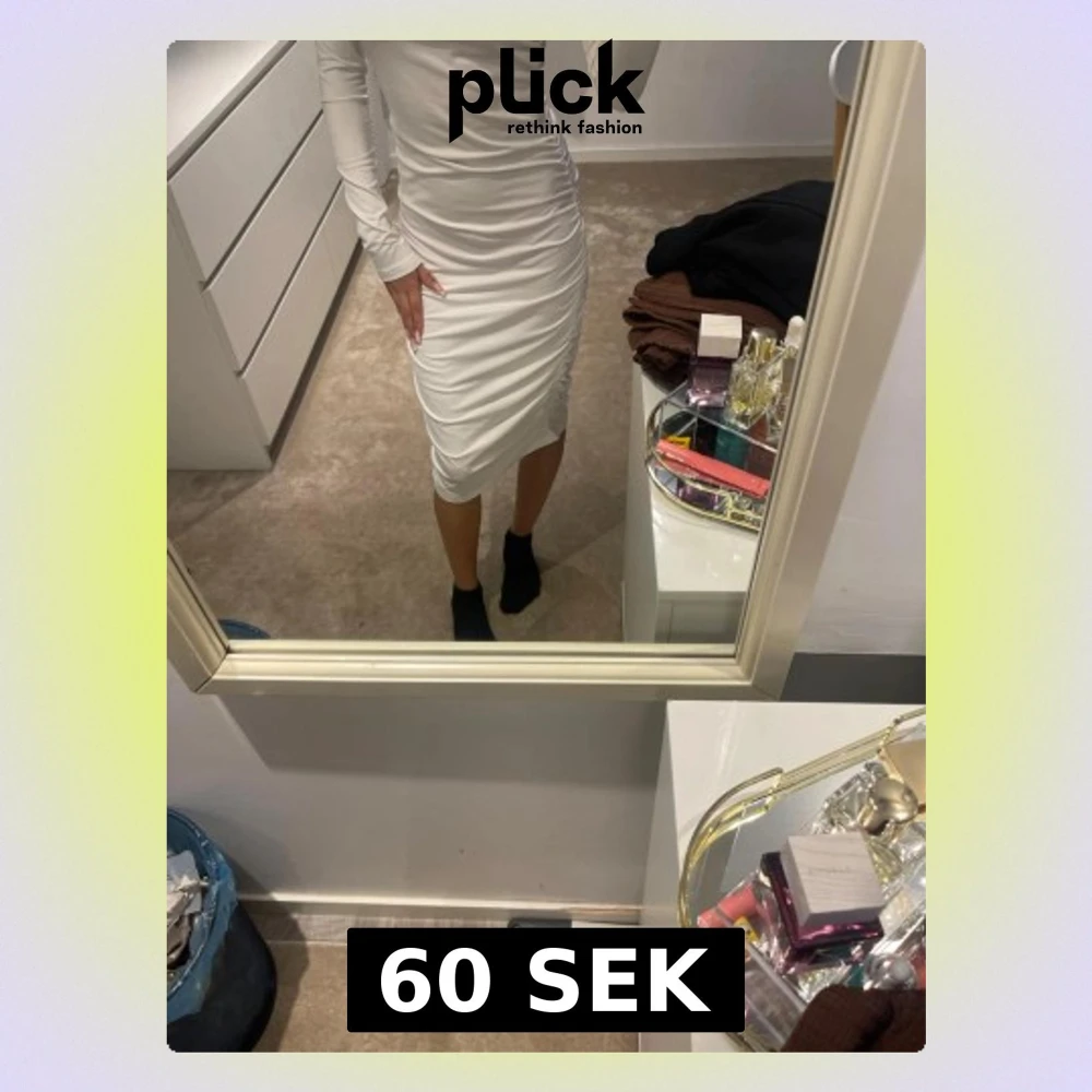 Snygg vit klänning med lång ärm och kroppsnära passform. Klänningen har en stilren design och slutar strax under knäna. Perfekt för dig som gillar en enkel men elegant look.