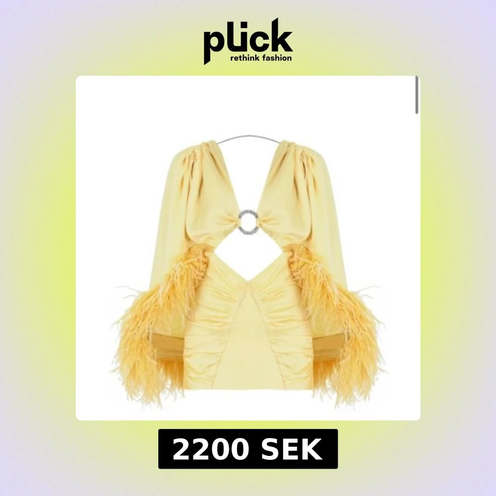 Superunik gul klänning med djup v-ringning, öppen rygg och snygg cut-out framtill. Klänningen har vida ärmar och är dekorerad med fluffiga fjädrar längs ärmarna. En glittrig ring framtill ger extra wow-känsla. Perfekt för dig som vill sticka ut! Saknas lite fjädrar se bild. Nypris ca 10.000kr