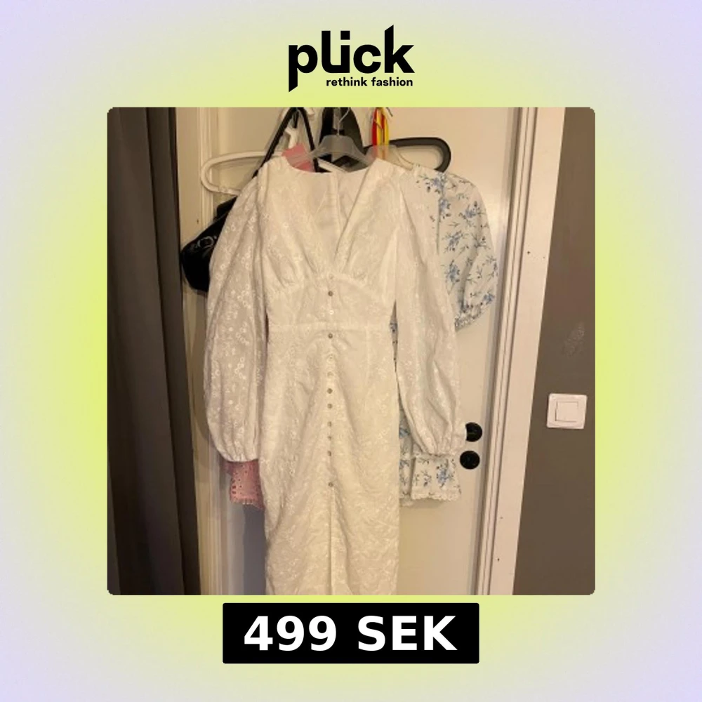 Superfin vit långklänning med broderade blommor, puffiga långärmar och snygg v-ringning. Klänningen är lik en adooreklänning. Säljer då den tyvärr är för liten💓