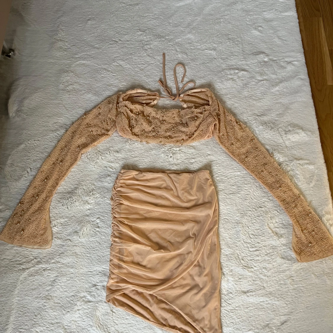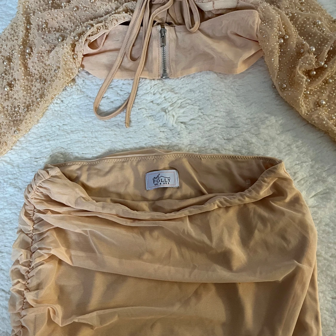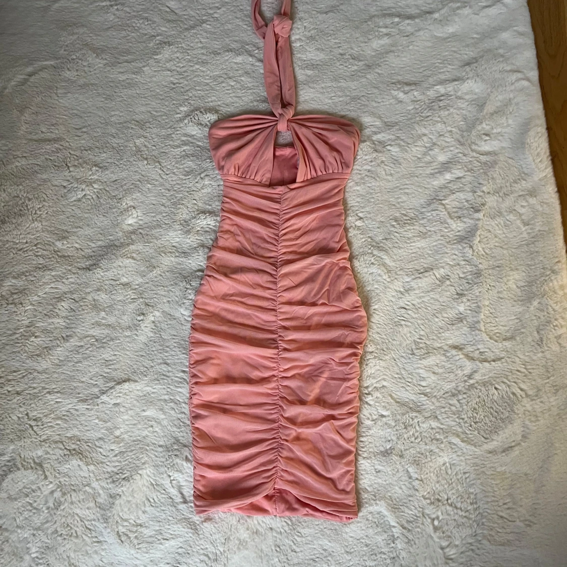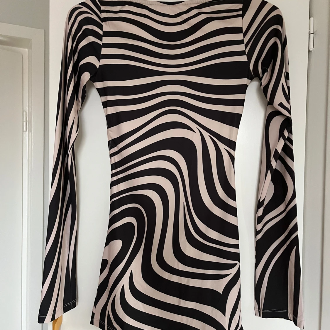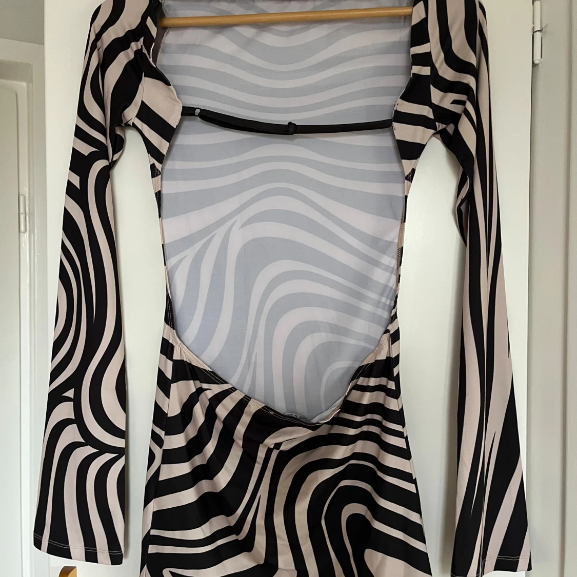 Snygg långärmad klänning med ett coolt svart och beige vågmönster. Den har en öppen rygg som ger en extra touch av stil. Perfekt för en utekväll eller fest!