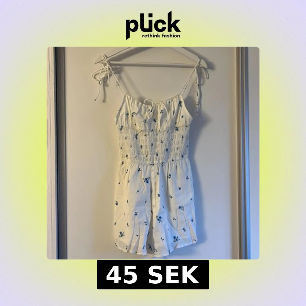 Charmig vit byxdress med blå blommor och smockdetaljer. Knytband på axlarna. Perfekt för varma sommardagar. Endast testad men passade ej.
