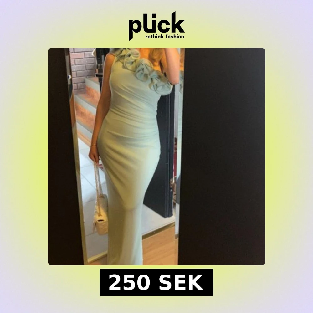 Supersnygg ljusgrön långklänning med figurnära passform och stora volangdetaljer vid axeln. Klänningen är ärmlös och har en elegant, stilren look som verkligen sticker ut. Perfekt för dig som vill ha något unikt och trendigt.