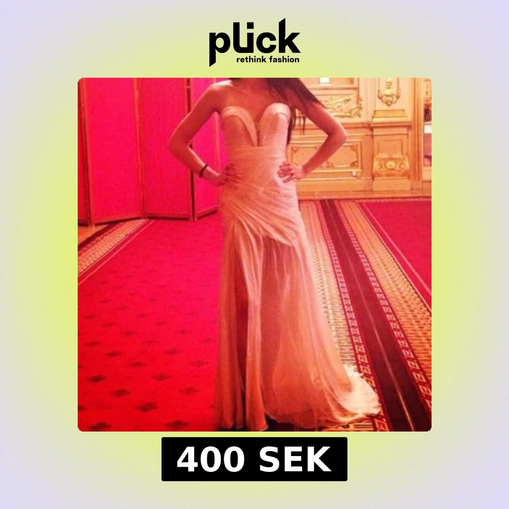 Elegant champagnefärgad långklänning med draperad design och axelbandslös stil. Klänningen har en vacker omlott-detalj och en subtil v-ringning. Perfekt för en glamorös kväll.