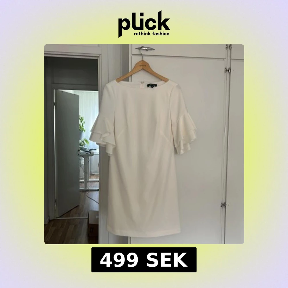 Superfin vit kortklänning från Lauren Ralph Lauren med volangärmar och rund halsringning. Klänningen har en stilren, rak passform och är gjord i ett mjukt polyestertyg. Perfekt för dig som gillar en clean och elegant look med extra detalj på ärmarna.