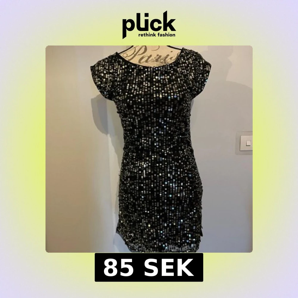 Supersnygg svart kortklänning täckt av glittriga paljetter. Klänningen har korta ärmar och en riktigt snygg öppen rygg med knyt i nacken.