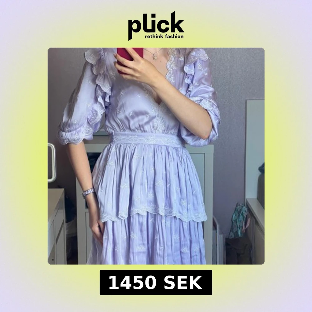 Superfin ljuslila klänning från Maje med broderade vita detaljer, volanger på ärmar och kjol samt v-ringning. Klänningen har trekvartsärmar och markerad midja. Använd en gång på halloween förra året!
