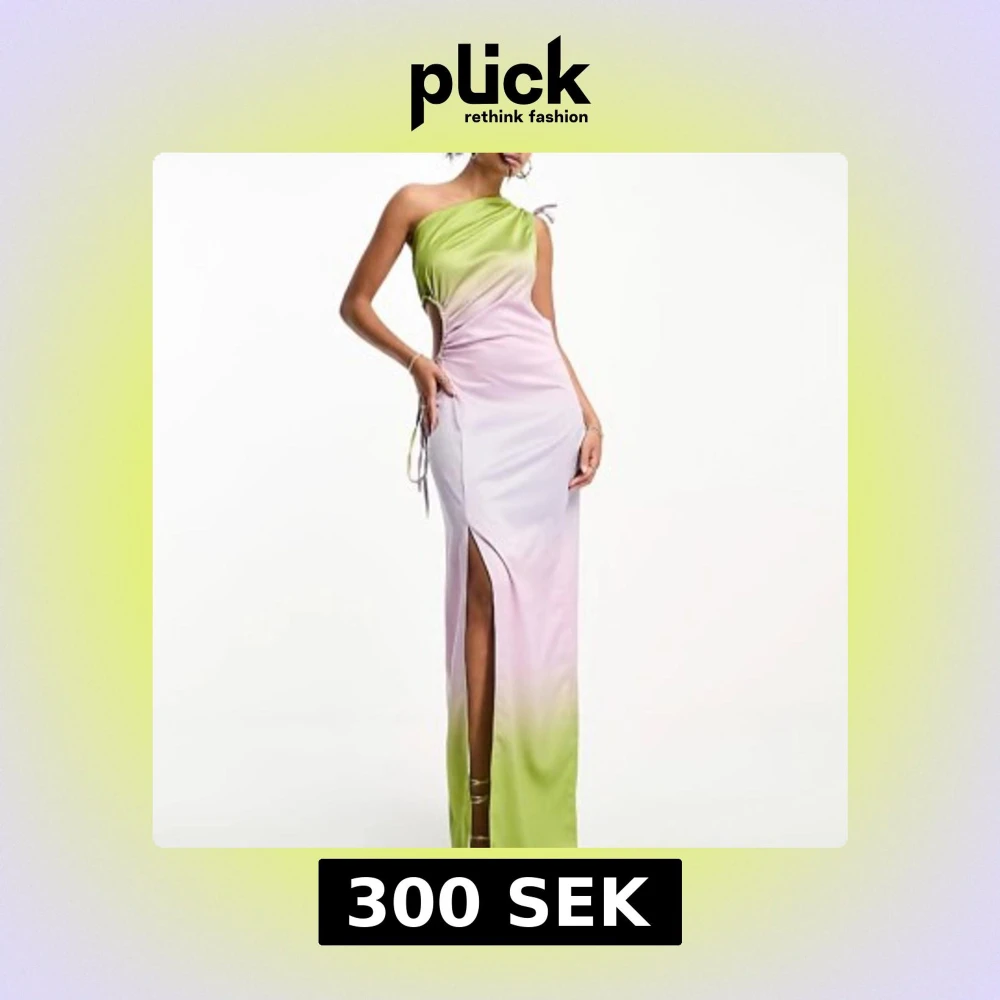 Säljer en snygg lång klänning med oneshoulder och slits. Klänningen har en cool ombre-effekt i ljusgrön och ljuslila, med snörningsdetaljer på sidan. Endast andvänd 1 gång i ett par timmar. Nypris: 935 SEK.
