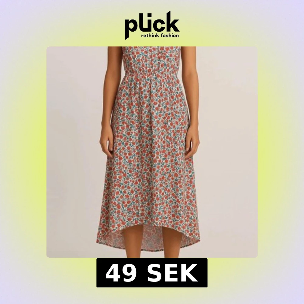 Säljer en söt blommig klänning i vitt, rött och grönt. Klänningen har volangärmar, v-ringning och resår i midjan för en smickrande passform. Perfekt för varma dagar och har en luftig, bekväm känsla.
