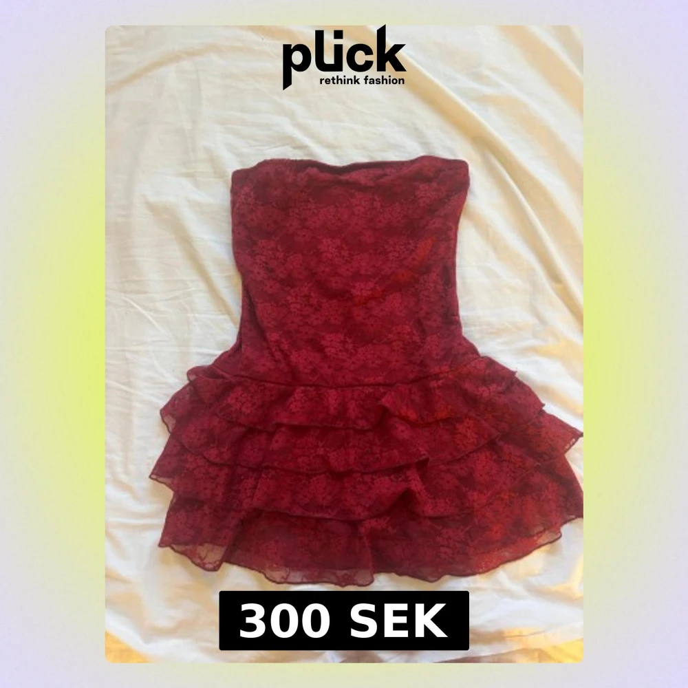 Säljer en vinröd axelbandslös klänning med flera lager volanger och vacker spets över hela klänningen. Den har en kort och figurnära passform som ger en snygg siluett. Perfekt för dig som vill sticka ut med en romantisk och trendig look.