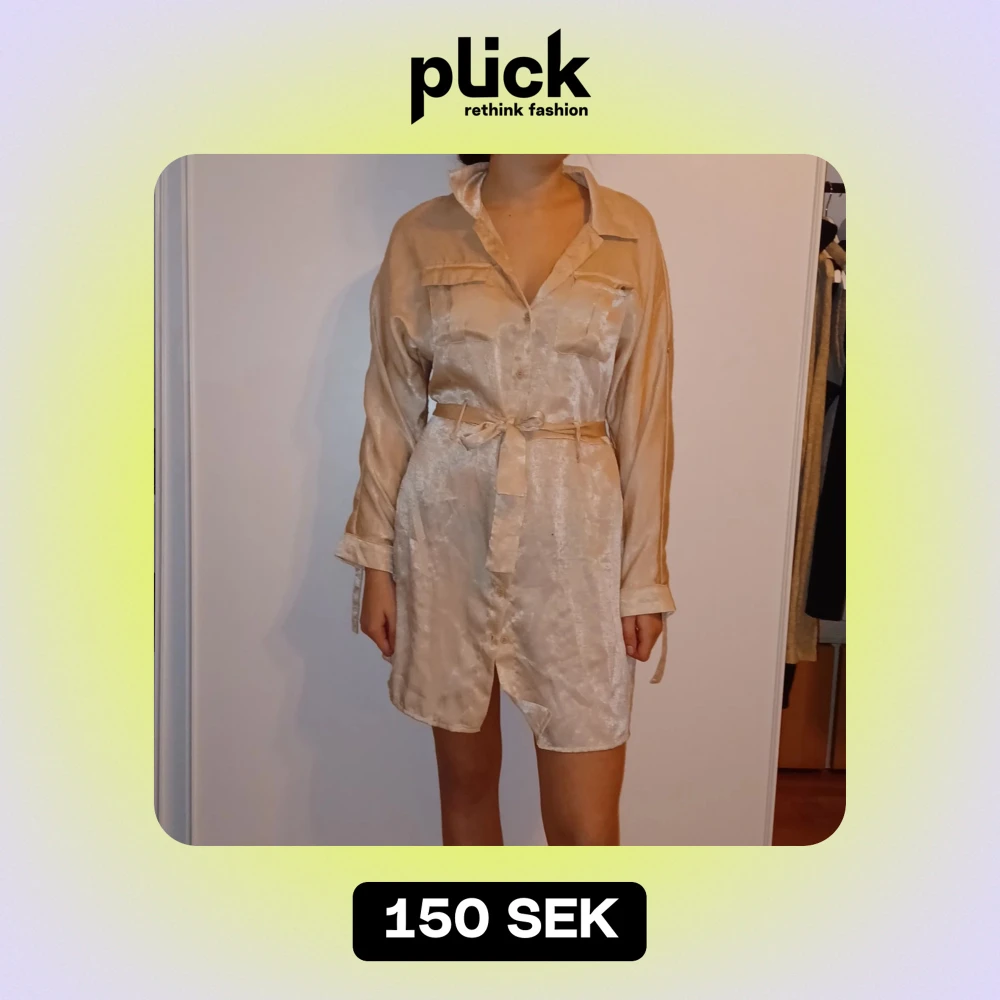 Snygg beige klänning i siden med lång ärm och knytbälte i midjan. Perfekt för både vardag och festliga tillfällen. Den har en klassisk krage och knappar framtill för en stilren look. Passar bra till vår och sommar.