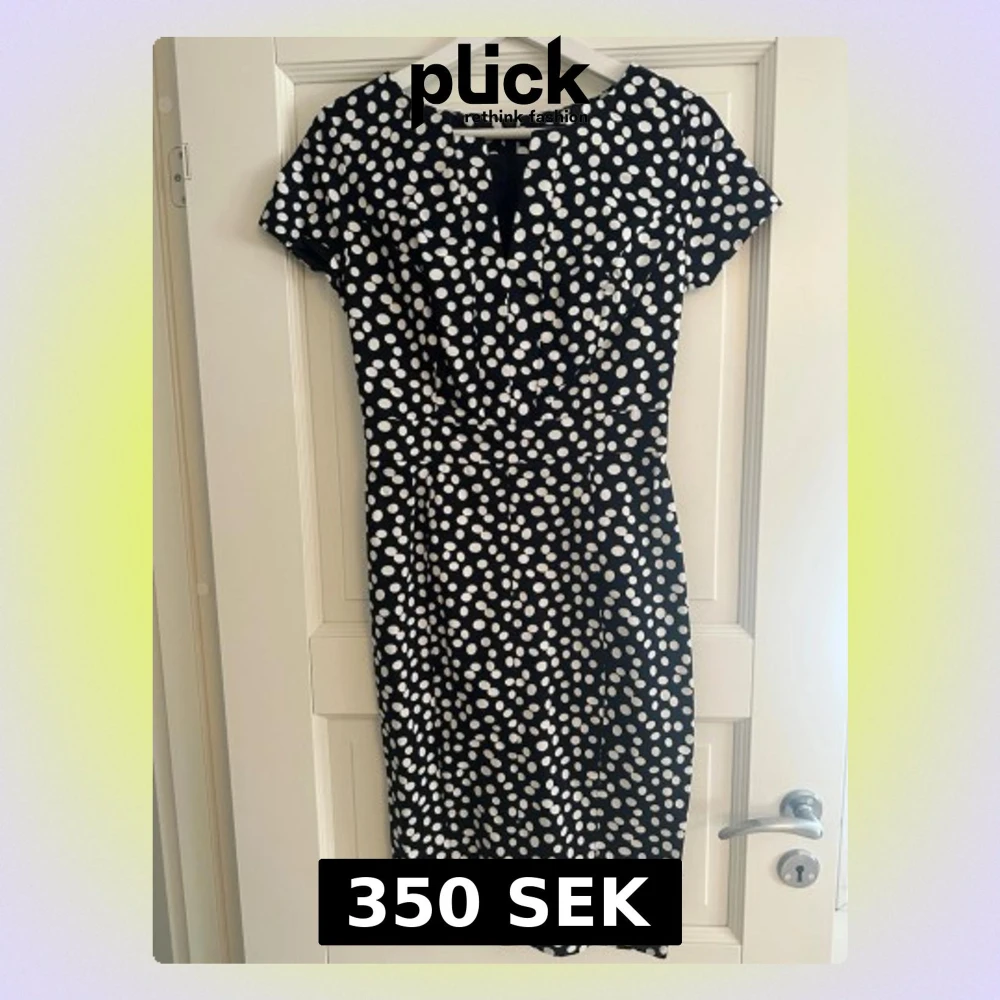 Snygg svart klänning med vita prickar från Oasis. Modellen är figurnära med kort ärm och v-ringning framtill. Klänningen har dragkedja i ryggen och är knälång, perfekt för en trendig look. Aldrig använd pågrund av för liten storlek.