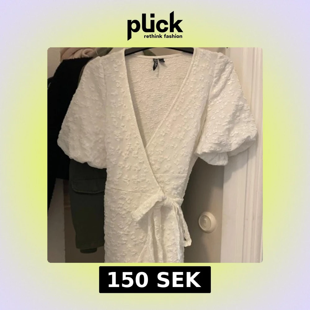 Superfin vit kort omlottklänning med puffärmar och knyt i midjan. Storlek xs knappt använd❣️perfekt studentklänning