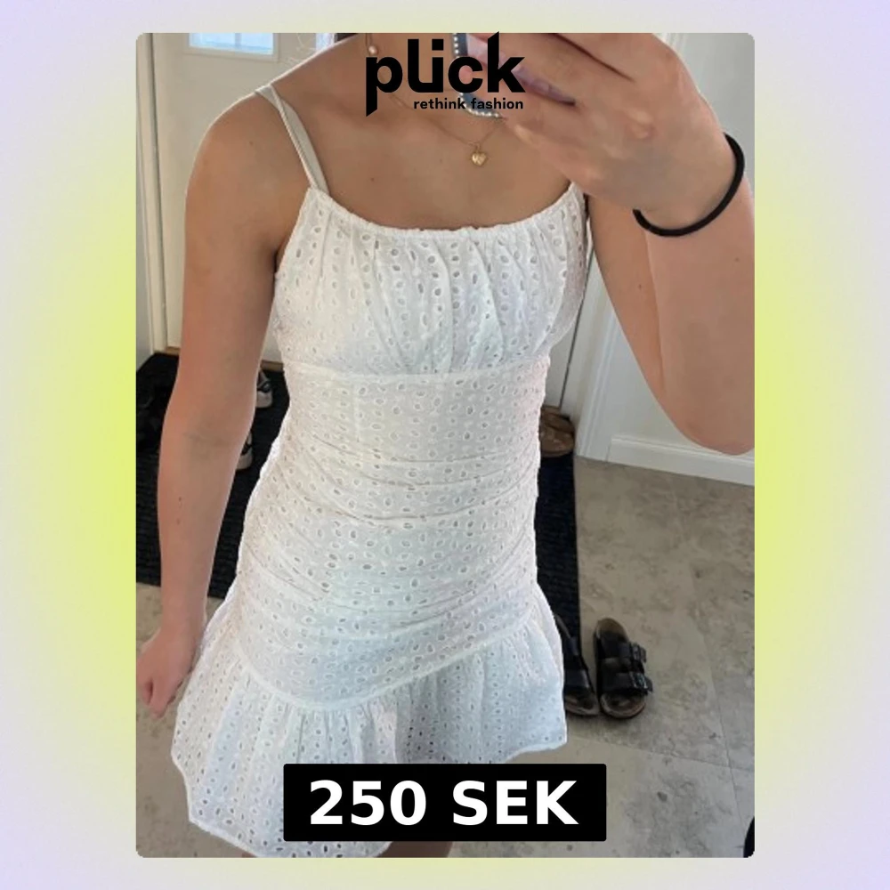 Söt vit kort klänning med smala axelband och volang nedtill. Klänningen har ett broderat hålmönster över hela tyget och en figurnära passform. Perfekt för sommarens alla tillfällen och ger en fräsch och trendig look.