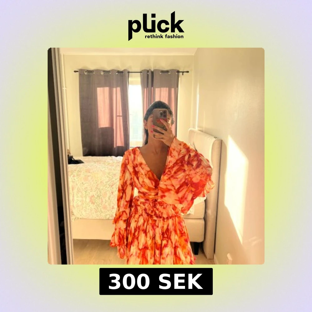 Säljer en färgstark kortklänning med v-ringad hals och stora volangärmar. Klänningen har ett unikt mönster i rött och orange, omlottliv och markerad midja. Materialet känns lätt och luftigt, perfekt för dig som gillar att sticka ut med din stil.