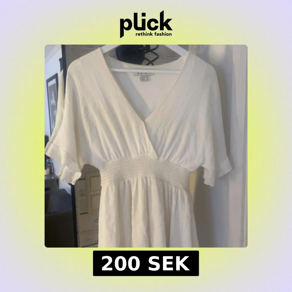 Säljer en superfin vit kortklänning med omlottkänsla och volangdetaljer. Klänningen har v-ringning, korta vida ärmar och smock i midjan för en bekväm passform. Perfekt för sommarens alla tillfällen!