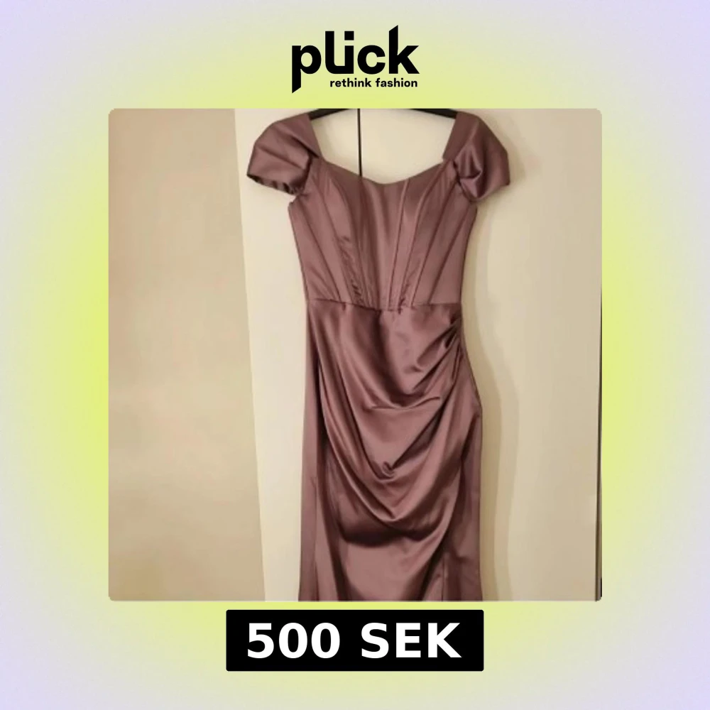 Elegant ljuslila långklänning i satinliknande material med offshoulder-ärmar, markerad midja och snygg drapering framtill. Baksidan har dekorativ snörning som ger en extra detalj. Perfekt för dig som vill sticka ut med en romantisk och trendig look.
