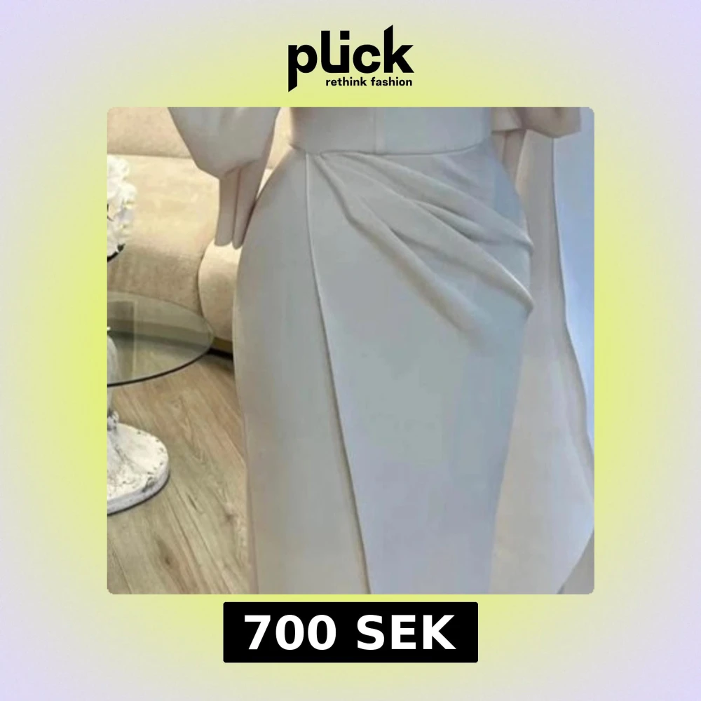 Säljer en elegant beige långklänning med fyrkantig urringning och dramatiska puffärmar. Klänningen har omlott-detalj framtill och figurnära passform som framhäver silhuetten. Perfekt för dig som vill sticka ut med en stilren och modern look.