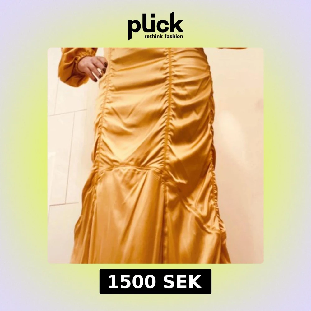 Snygg långklänning i guldig satin med markerad rynkning längs hela klänningen. Modellen har långa puffärmar och en figurnära passform som ger en lyxig och trendig look. Perfekt för dig som vill sticka ut med en elegant och modern stil. Aldrig använd.