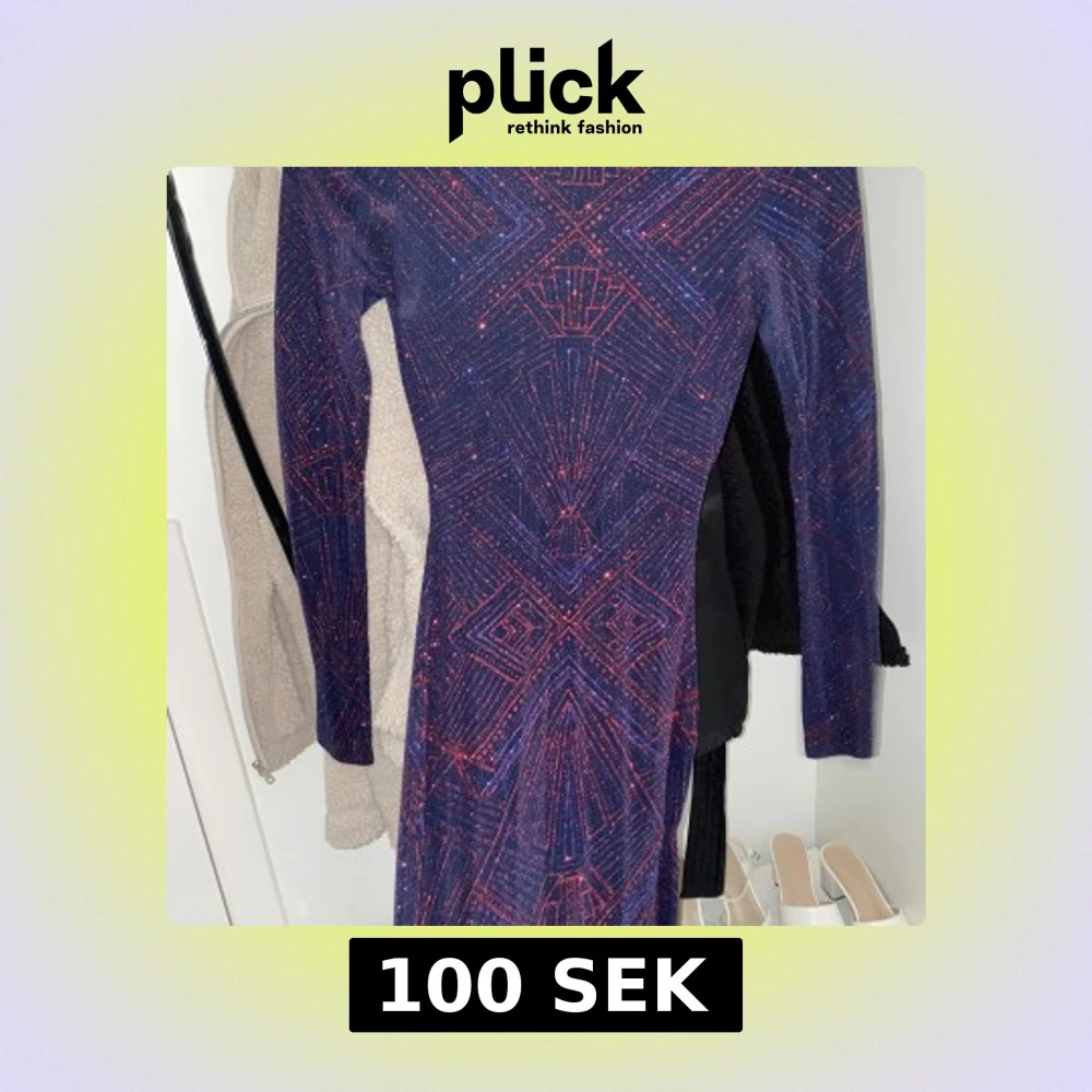 Säljer en mörkblå långklänning med glittrigt rött geometriskt mönster. Klänningen har långa ärmar och en stor öppen rygg, vilket ger en riktigt snygg och unik look. Perfekt för dig som vill sticka ut på festen!