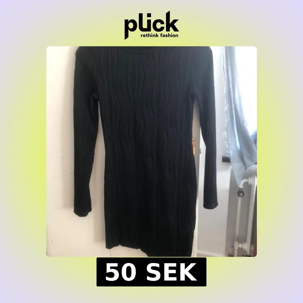 Säljer en svart långärmad klänning med coolt ribbat vågmönster. Klänningen är kort och har en rund halsringning. Materialet känns mjukt och stretchigt, perfekt för dig som gillar stilrena och enkla plagg med lite edge.