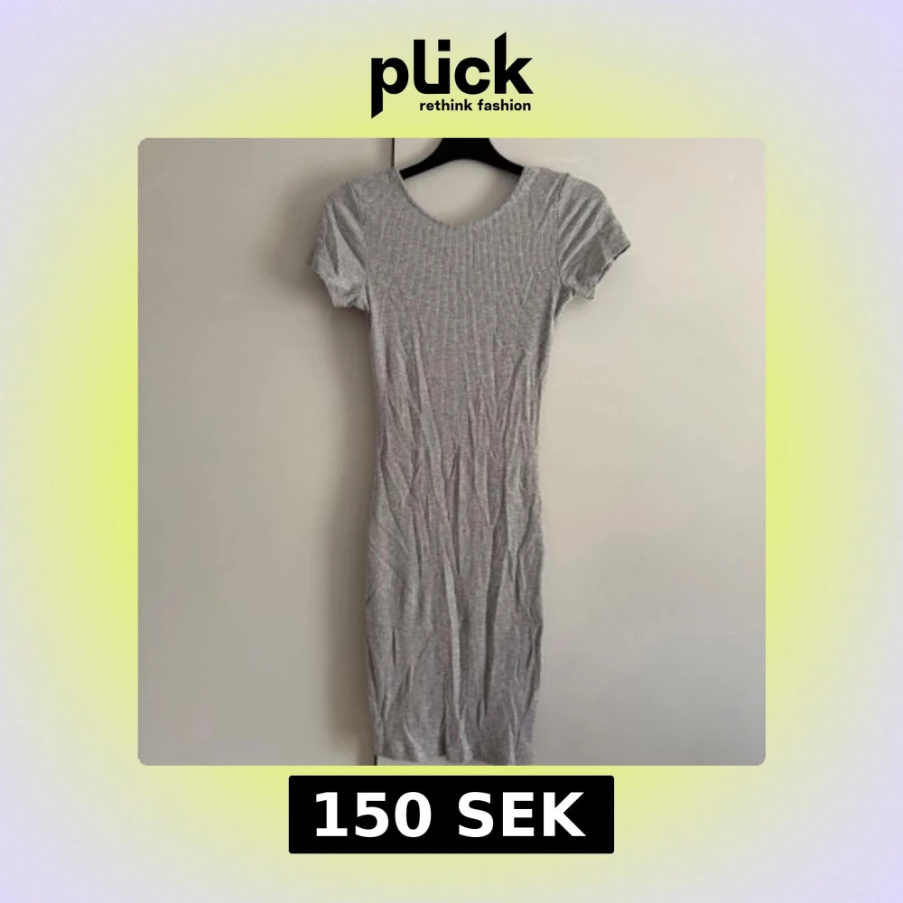 Säljer en grå ribbad kortklänning med rund hals och korta ärmar. Klänningen har en djup, öppen rygg och är figurnära i modellen.