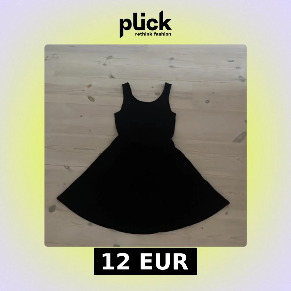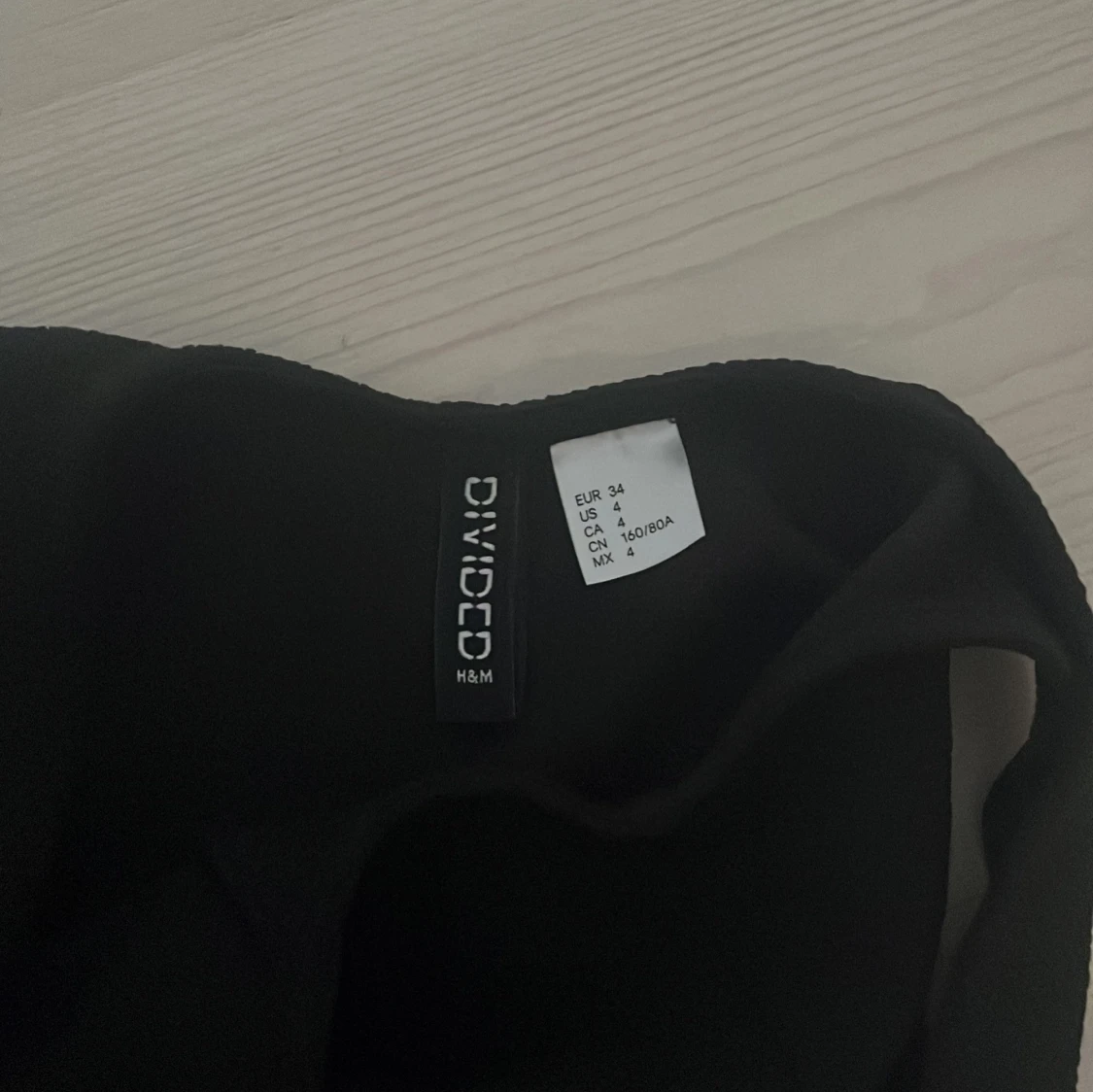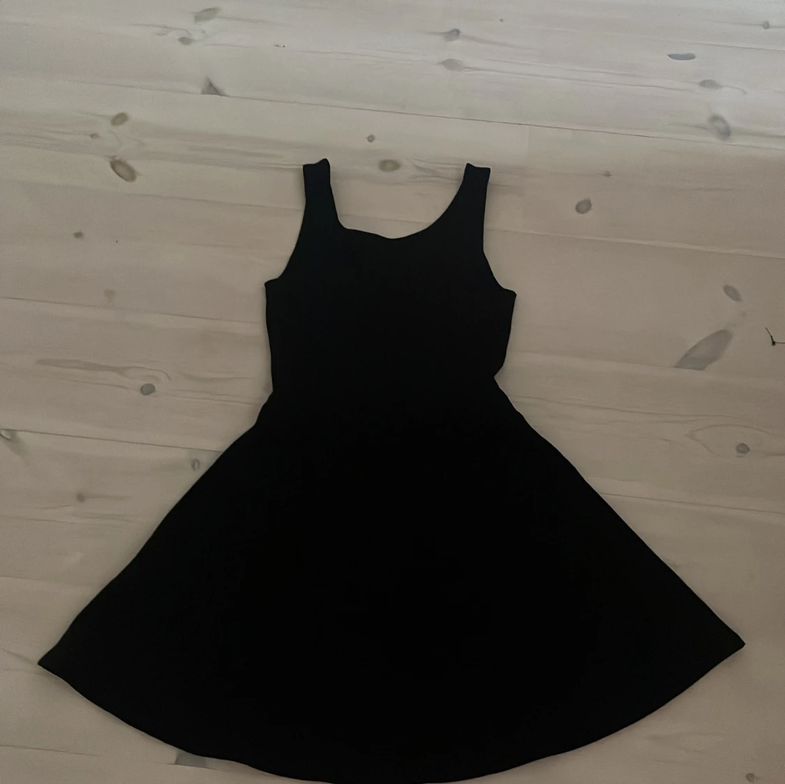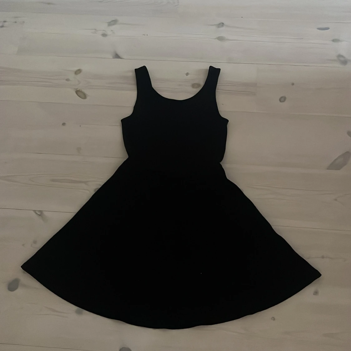 Säljer en svart, ärmlös klänning från H&M Divided i storlek 34. Klänningen har en rundad halsringning och en utställd kjol som ger en snygg siluett. Perfekt för dig som gillar enkel och stilren design. Materialet känns mjukt och bekvämt mot huden.