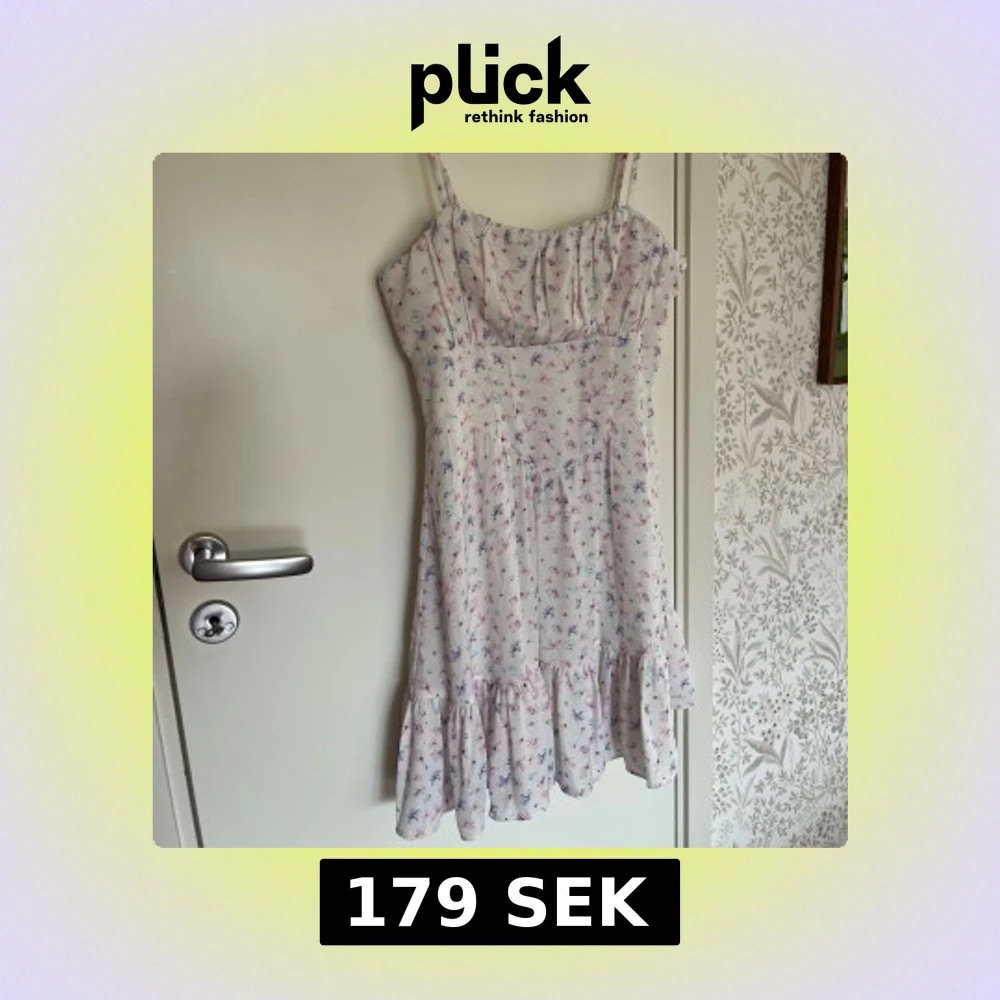 Supersöt kort klänning med smala axelband från NA-KD. Vit med små blommor. Volang nertill och dragkedja i sidan. Nypris runt 300-400 kr men finns inte att köpa längre. Använd 2-3 gånger💓
