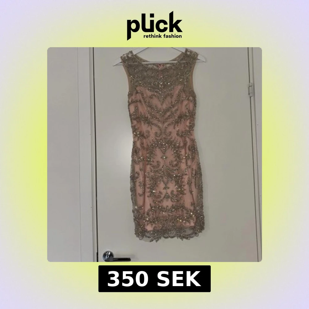 Superfin kortklänning i aprikosfärg med massor av glittriga paljetter och pärlor i ett detaljerat mönster. Klänningen är ärmlös, har rund halsringning och en figurnära passform. Perfekt för bal eller fest när du vill sticka ut och glänsa.
