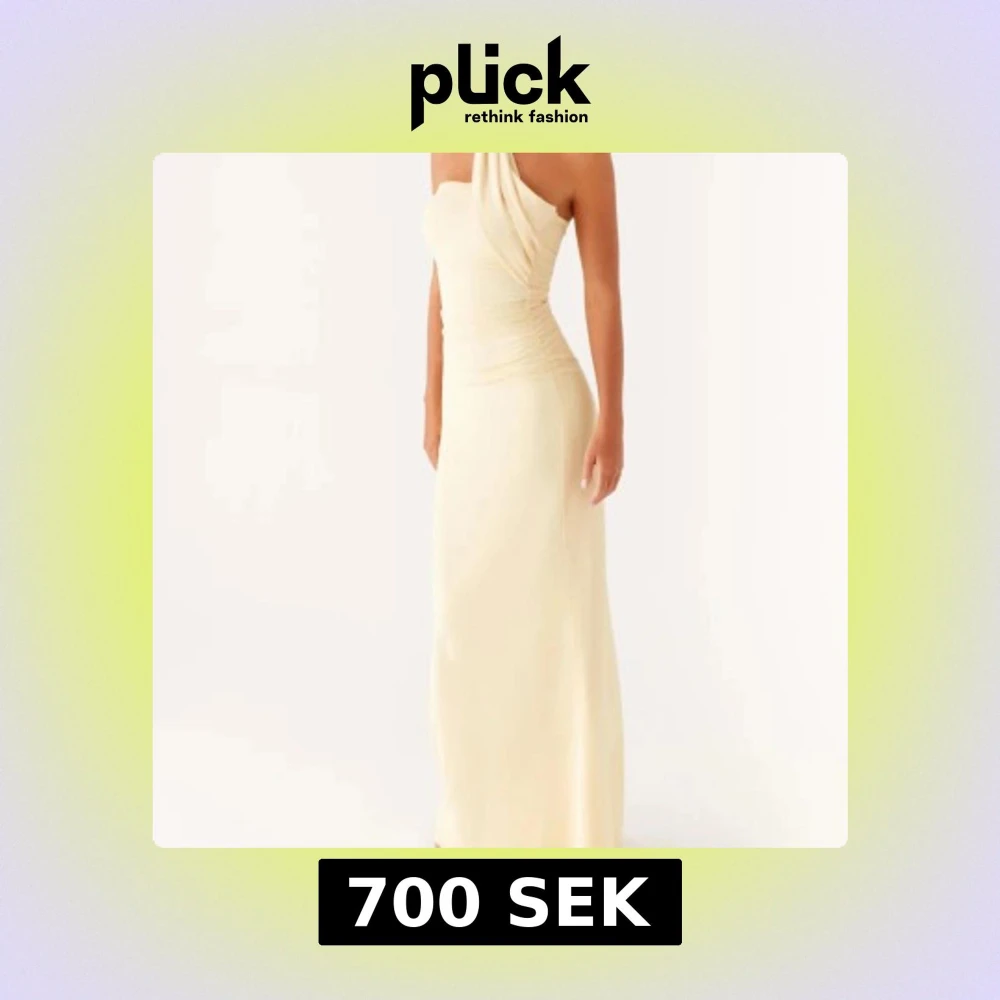 Supersnygg långklänning i champagnefärg med oneshoulder och draperad detalj över axeln. Klänningen har figurnära passform och är tillverkad i ett mjukt, stretchigt material som ger en lyxig känsla. Perfekt för dig som vill sticka ut med en elegant och modern look. Endast använd en gång.