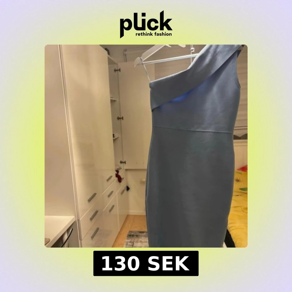 Snygg ljusblå klänning med one shoulder-design och volang nertill. Klänningen har en synlig dragkedja på baksidan och är figurnära med en stilren look. Perfekt för dig som vill sticka ut med en modern och trendig stil.