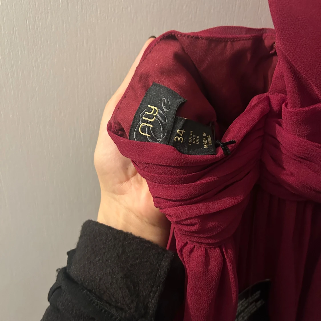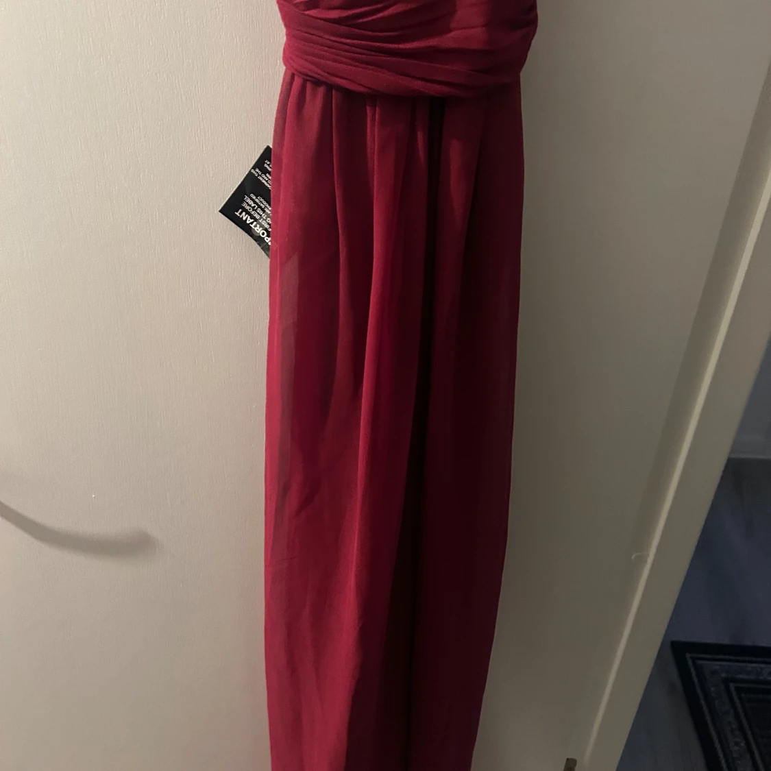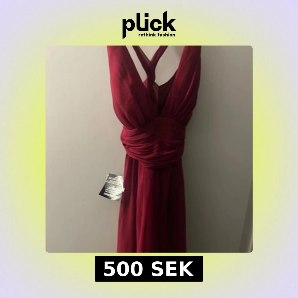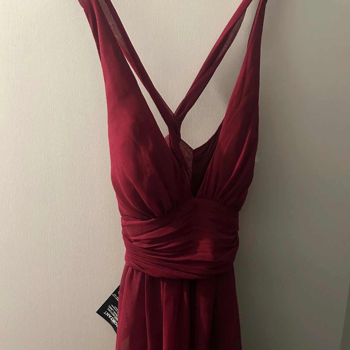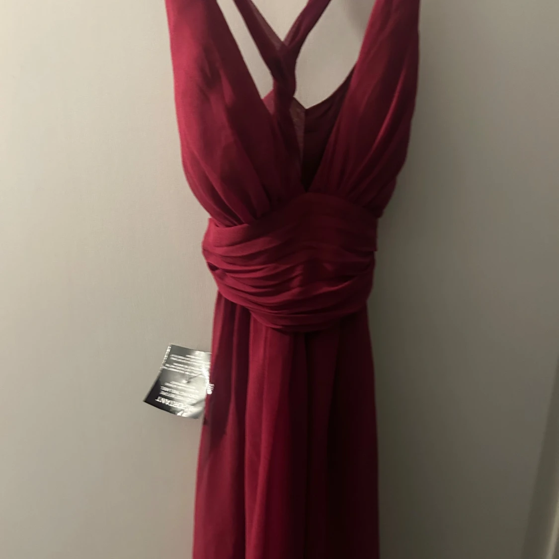 Vinröd långklänning från Alyce med v-ringad omlott-topp och breda axelband som korsas i ryggen. Helt ny