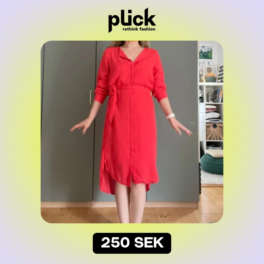 Korallröd skjortklänning med knyt i samma färg. Aldrig använd. Storlek 34 men rymlig och kan passa upp till 38 skulle jag gissa.