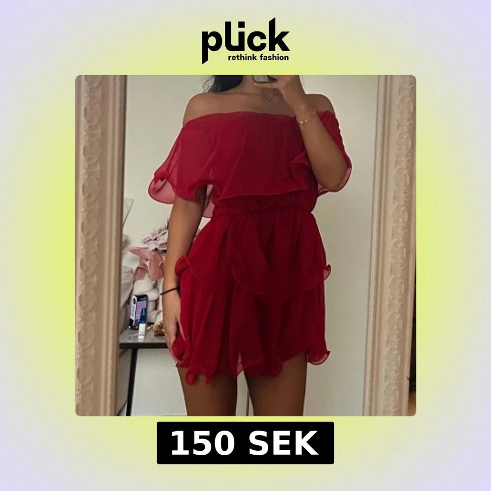 PLT- röd kortklänning med offshoulder och volangdetaljer. Klänningen har en luftig och flowy känsla med flera lager och elastisk midja.