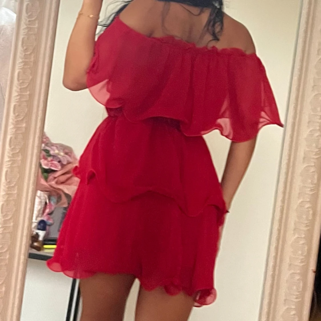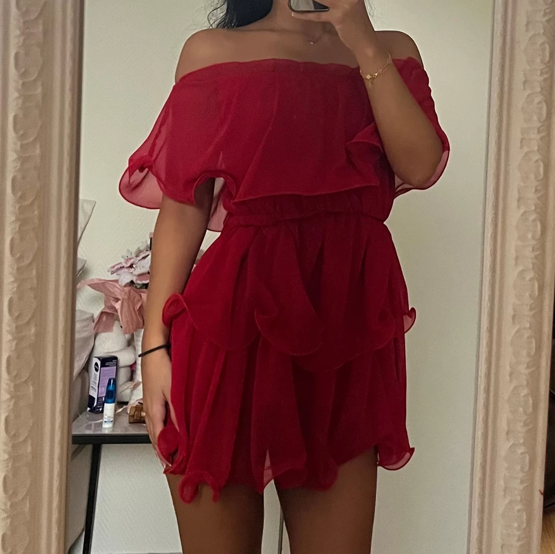 Röd offshoulder volangklänning