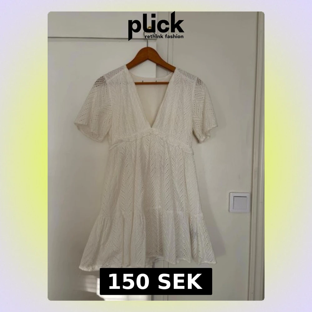 Superfin vit klänning med v-ringning och korta puffärmar. Klänningen har broderade spetsdetaljer i ett snyggt mönster och volang nertill. Perfekt för sommarens alla tillfällen och har en luftig passform.
