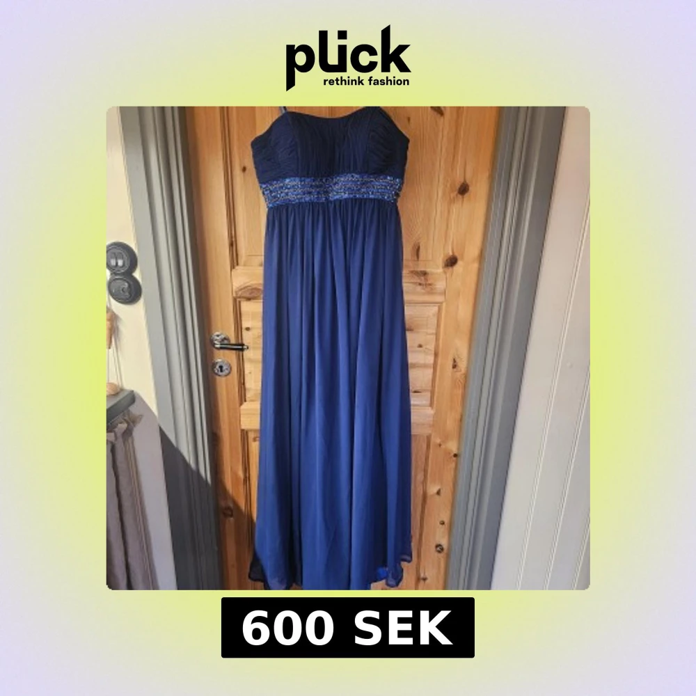 Snygg marinblå långklänning med smala axelband och vackert rynkad överdel. Midjan är dekorerad med glittriga paljetter som ger extra wow-känsla. Kjolen är luftig och faller fint ner till golvet. Perfekt för bal eller festliga tillfällen. Marinblå klänning som bara har använts en gång. Storlek xs men sitter fint för s/m också💕