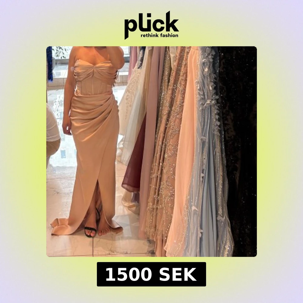 Supersnygg axelbandslös långklänning i champagnefärgad satin med draperad midja och markerad byst. Klänningen har en elegant slits framtill och en figurnära passform som ger en lyxig känsla.